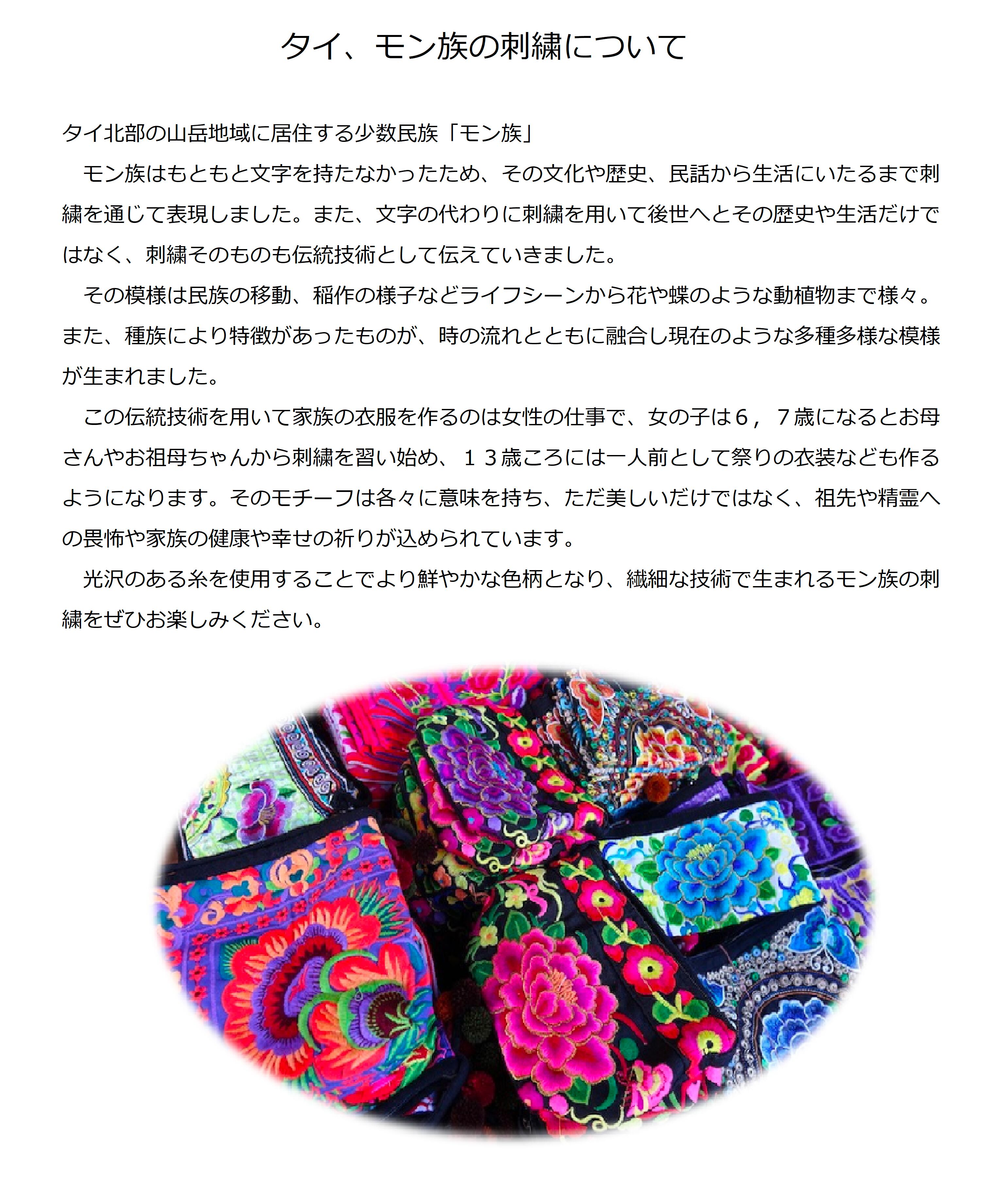本品の刺繍はタイの山岳少数民族であるモン族に伝わる伝統文化の一つです。