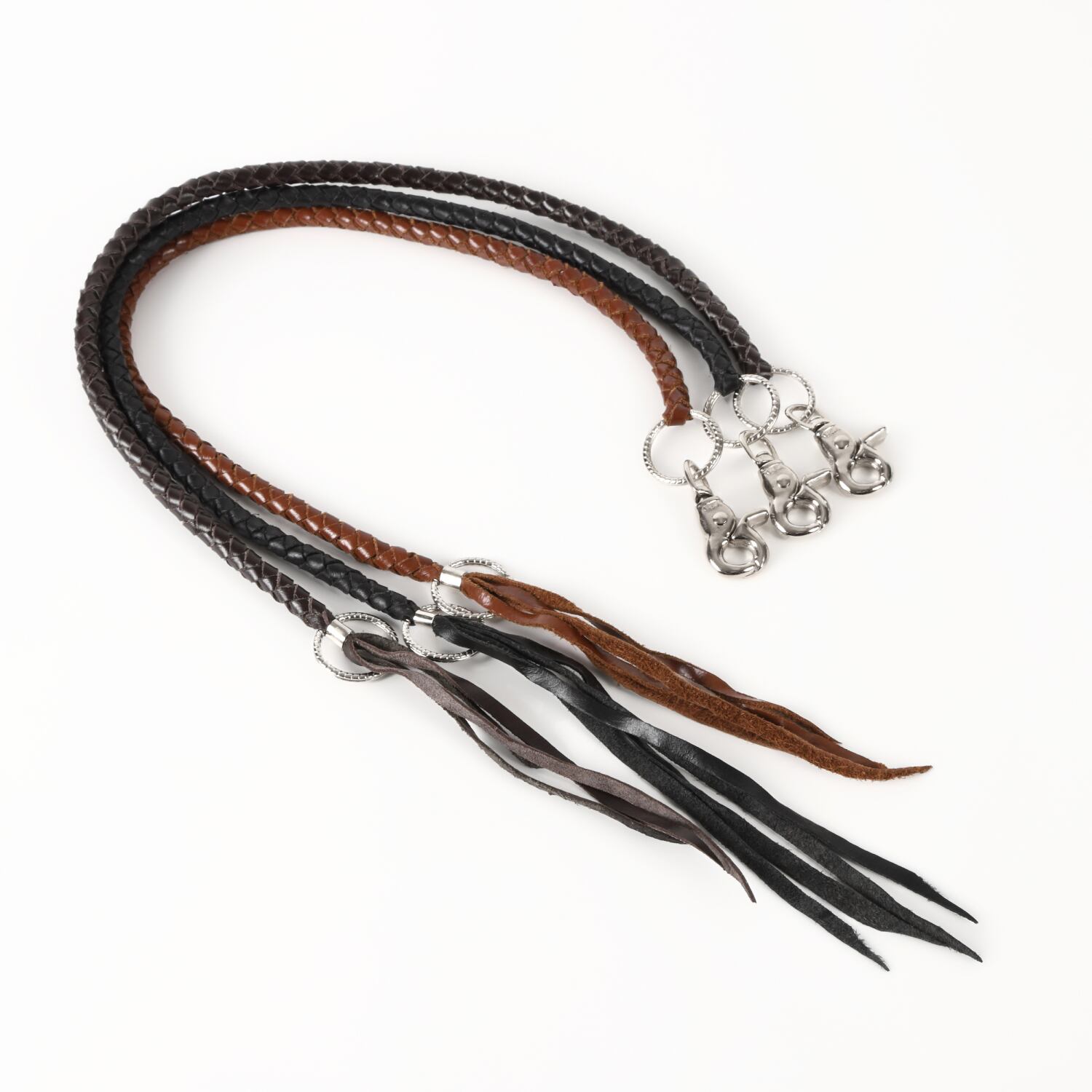 素材:牛本革/オイルレザー カラー:ブラック、ブラウン、ダークブラウン サイズ:本体約50cm、幅1cm程度 金具:二重リング外径3cm、カニカン長さ5cm 開口部:約1cm 重さ:約50g ※ハンドメイド品のため個体差があります。